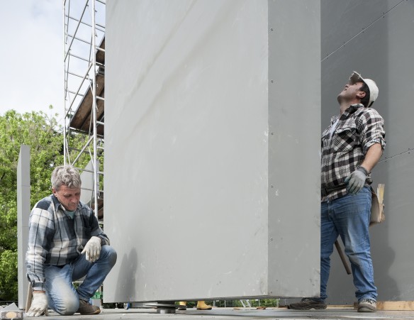The work documents the theatre’s reconstruction through to its full installation, showing us the faces and moving bodies of those who actively participated in the ongoing work: workers are the leading actors in an invisible theatre, the stage is set.